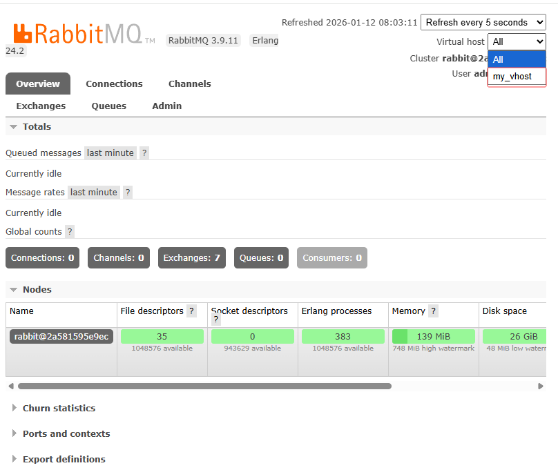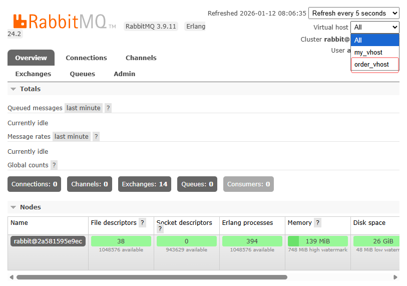 登录Web管理界面 (http://<服务器IP>:15672)。在顶部导航栏的下拉框中,你可以自由切换查看 order_vhost 和 log_vhost 内的所有队列、交换机等资源,实现集中监控。
