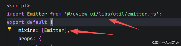 2、完成之上步骤,应该可以看到dispatch方法报错,那是因为我们的代码中没有这个方法。这个方法需要用到uview表单中的公共方法,使用如下:在自定义扩展表单组件中引入 Emitter,并使用
