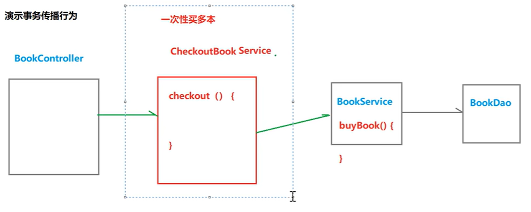 checkouts是事务方法,buyBook是事务方法,两个方法调用过程中,演示传播行为。