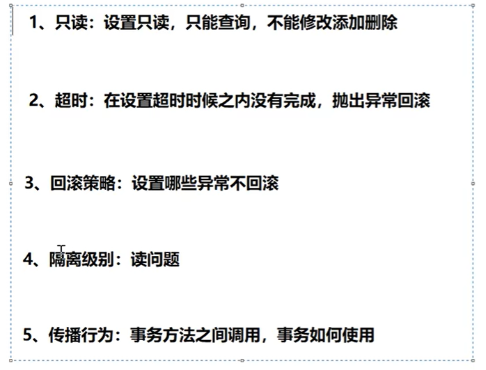 - NOT_SUPPORTED:以非事务方式运行,如果有事务存在,挂起当前事务 【不支持事务,存在就挂起】