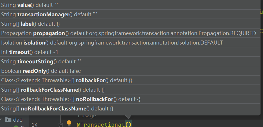 - MANDATORY:必须运行在一个事务中,如果当前没有事务正在发生,将抛出一个异常 【有就加入,没有就抛异常】