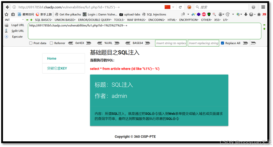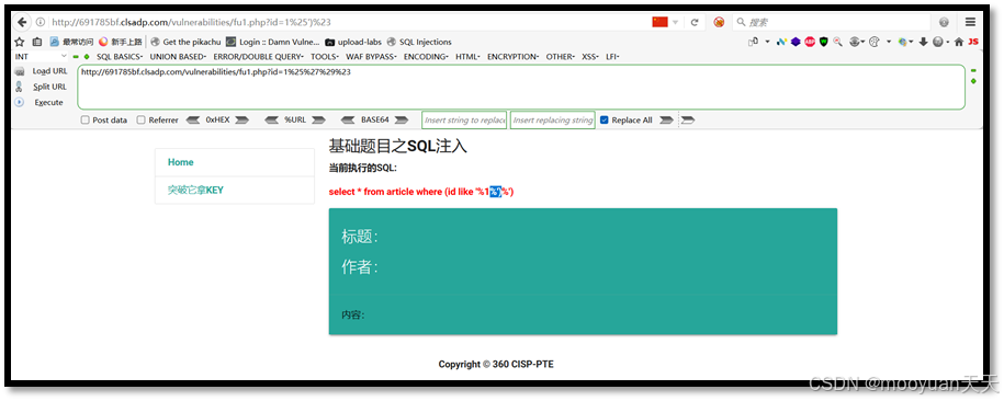 根据id=1时SQL语句为select * from article where id= (1),构造payload为id=1%')# ,此时SQL语句应该为select * from article where (id like '%1%')%# %') ,然而由于参数使用GET方法传递,在URL地址栏应该对**1%')#**进行URL编码,如下所示。