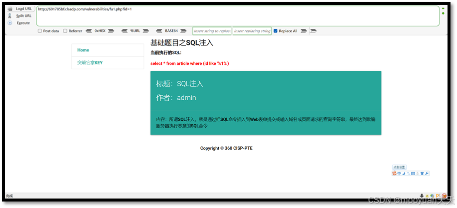 打开靶场,页面提示"通过SQL注入读取/tmp/360/key文件,答案就在文件中",如下所示。