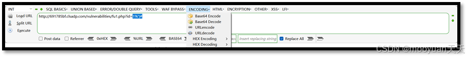 很明显页面显示SQL执行语句,注入参数为id,闭合方式为百分号、单引号和括号,而id在URL参数中传递,如下所示。