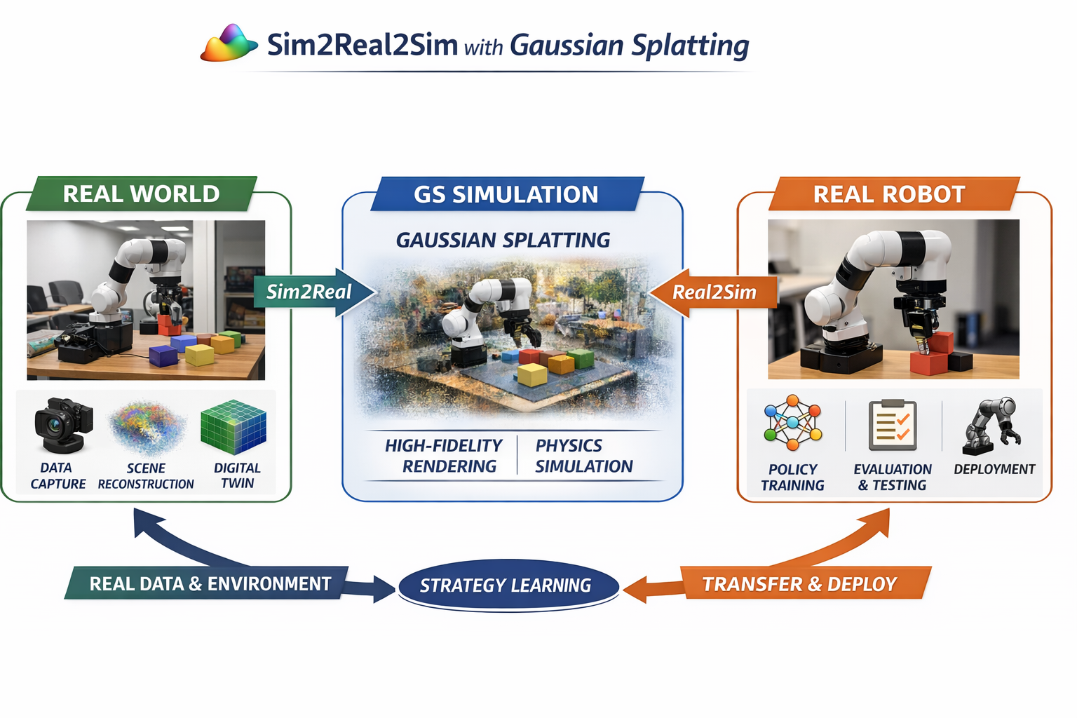 - 主要思想是用 高斯点渲染替代传统 mesh 渲染 来显著提高视觉质量,从而减少域差,提升 Sim2Real 迁移性能。