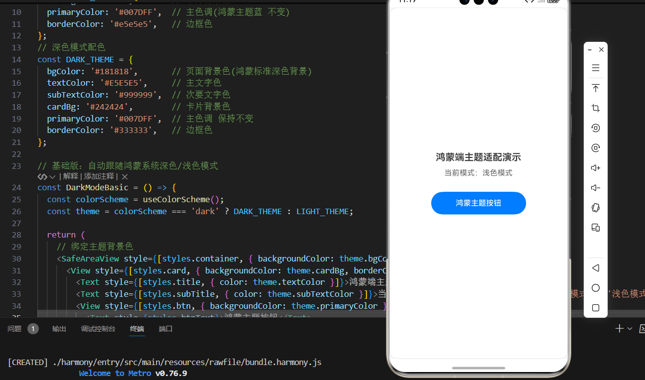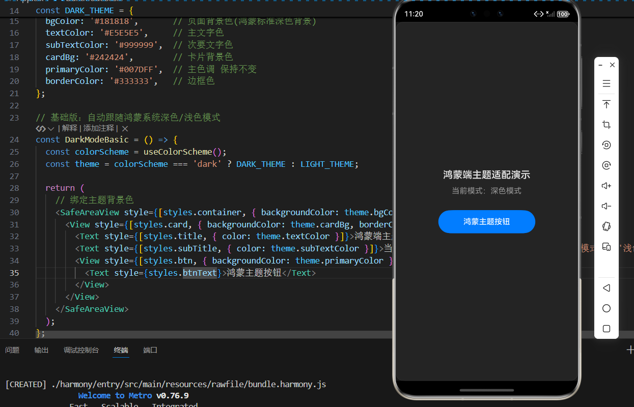 useColorScheme()获取当前系统的配色方案(light/dark); - 动态绑定主题样式:根据获取到的主题模式,匹配对应的主题配色常量,将配色绑定到组件的 style 样式中;