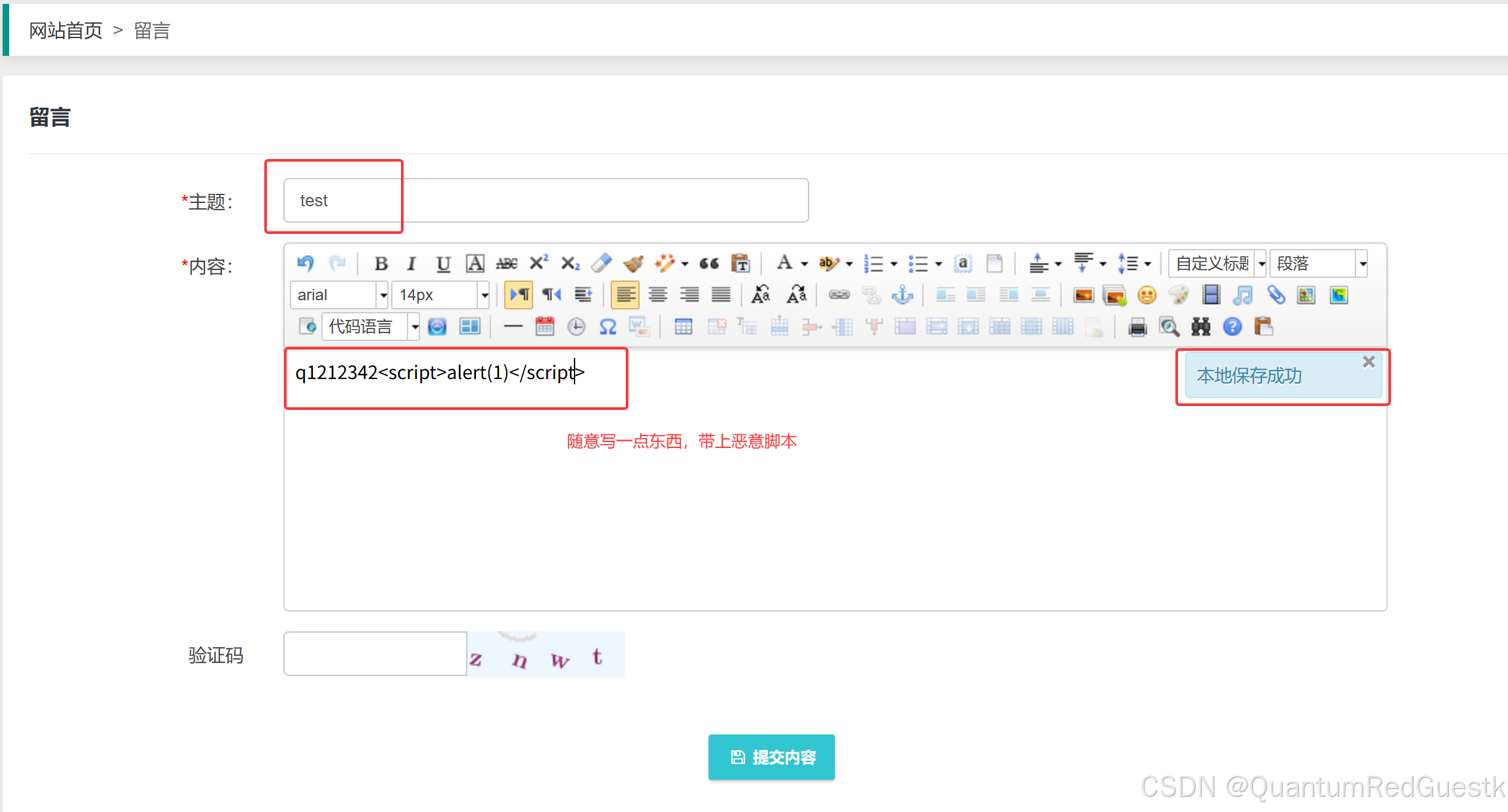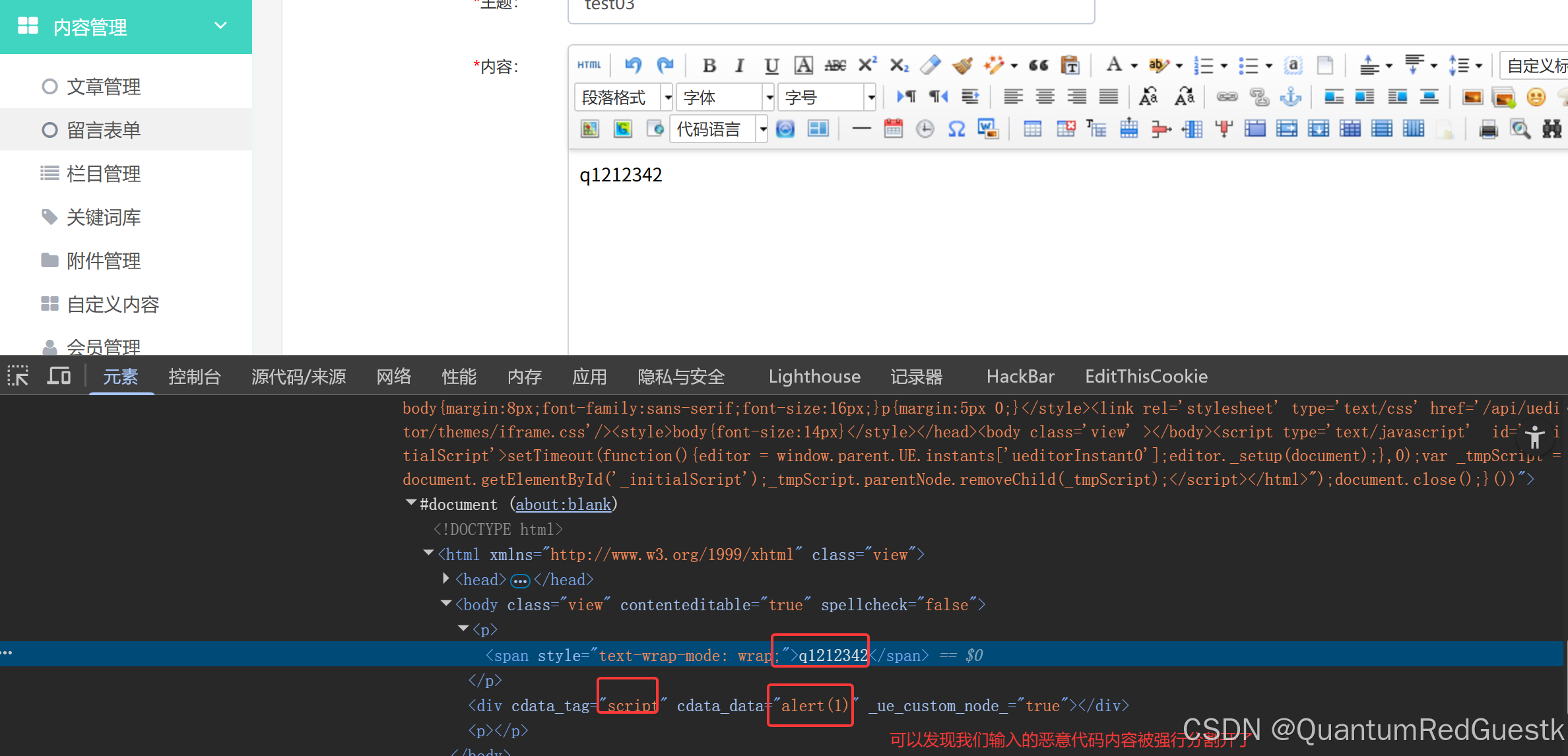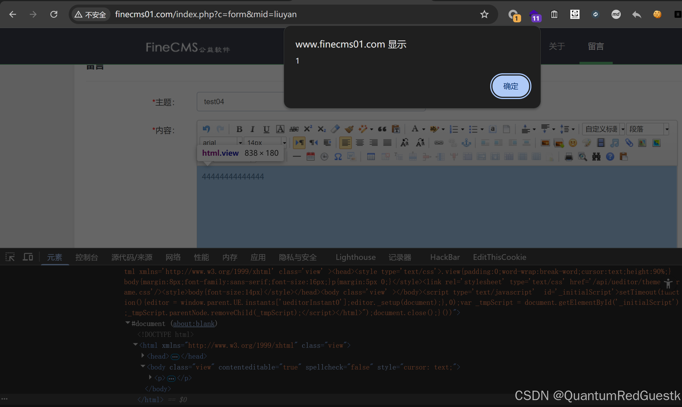 根据上文步骤,在检查的格式修改里把被实体编码的payload改掉之后,保存,前端页面出现了非预期的 JavaScript 执行现象。注意:这里弹窗之后,一定要添加点内容,让文本器自动保存之后,再提交内容。