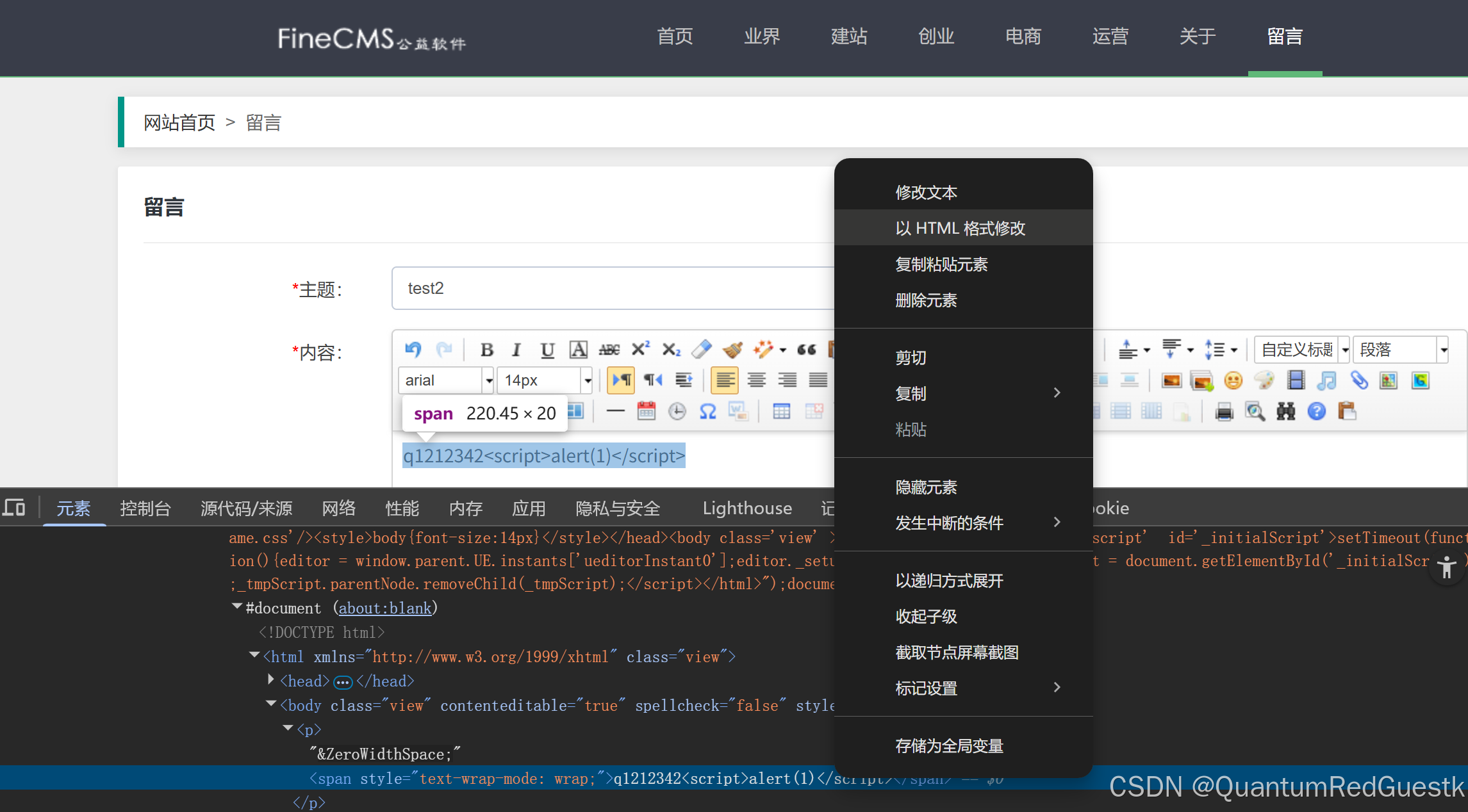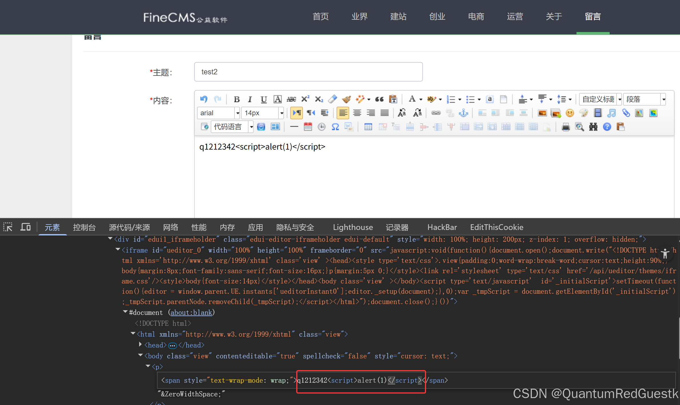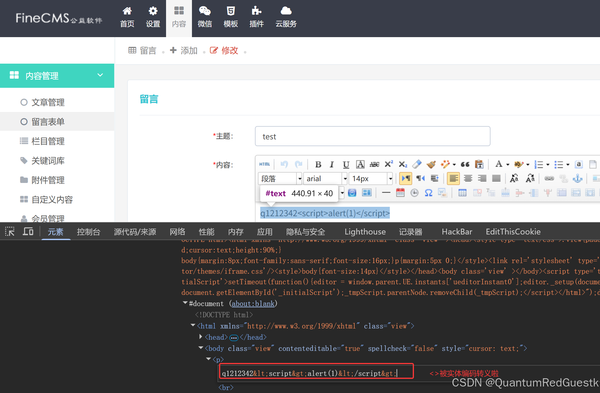 根据上文步骤,在检查的格式修改里把被实体编码的payload改掉之后,保存,前端页面出现了非预期的 JavaScript 执行现象。注意:这里弹窗之后,一定要添加点内容,让文本器自动保存之后,再提交内容。