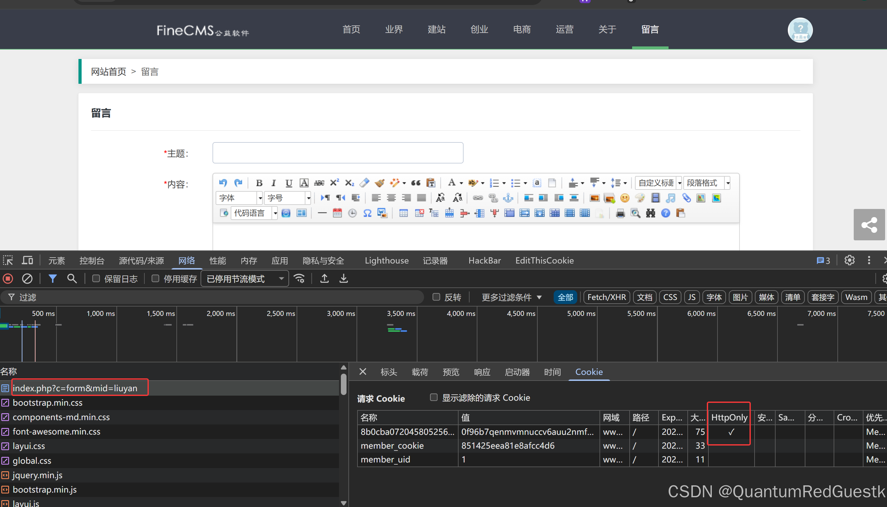 如果攻击者在这里利用xss注入一段前后端配合的存储型攻击链,当管理员登录后台并查看该留言时,XSS 被触发,其浏览器会自动将当前页面的 Cookie(若未设置 HttpOnly)发送至攻击者服务器。可能导致管理员会话被劫持。