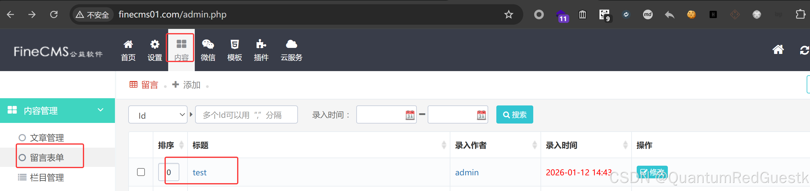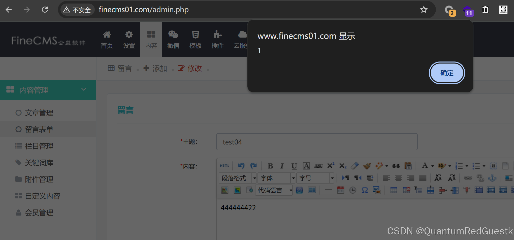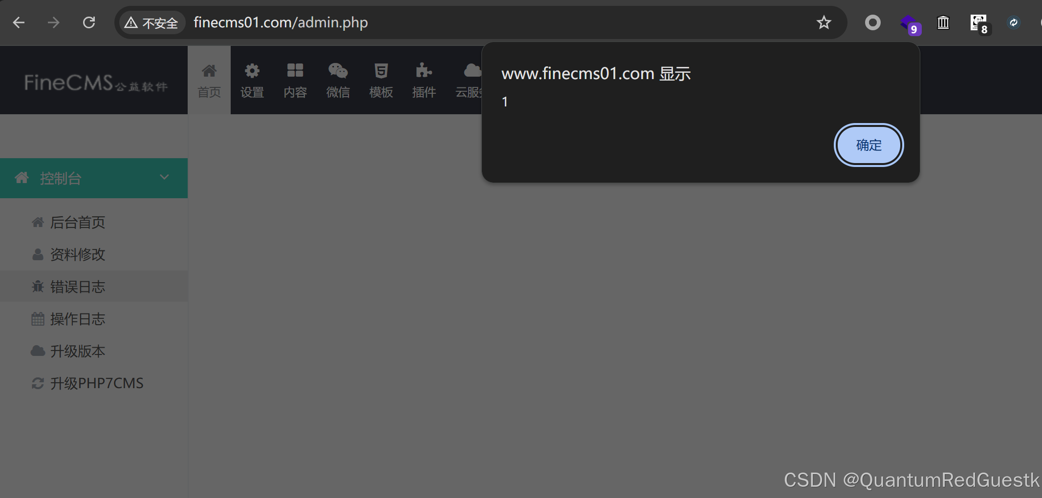 FineCMS 是一款开源的内容管理系统。经安全研究人员披露,该系统在特定版本中存在存储型跨站脚本(Stored XSS)漏洞,攻击者可利用该漏洞在管理员查看特定页面(如错误日志、留言管理)时执行任意 JavaScript 代码。