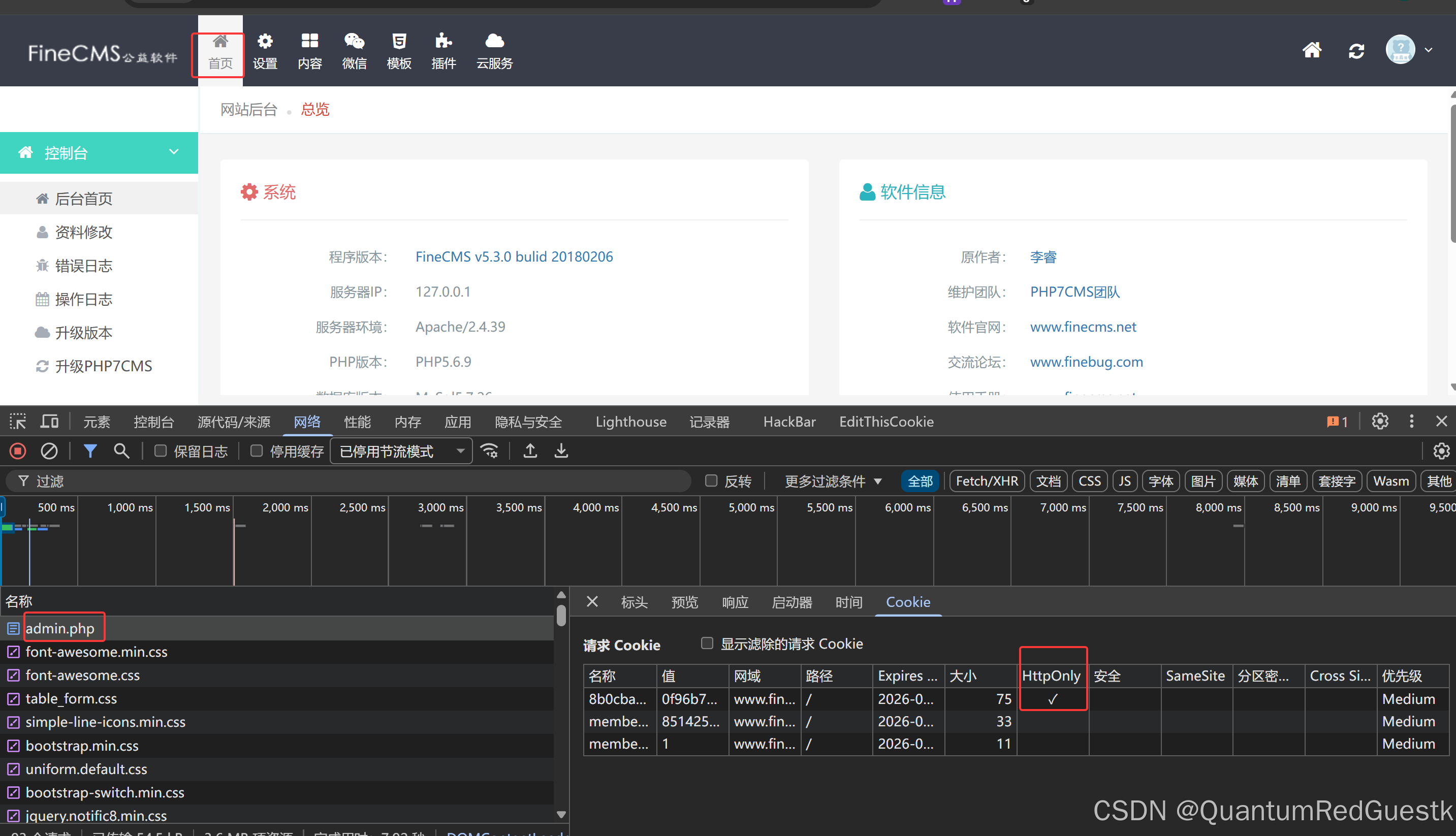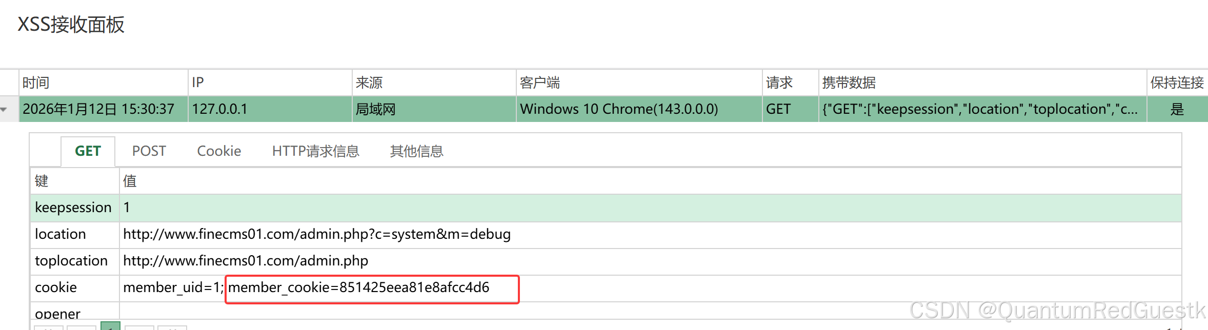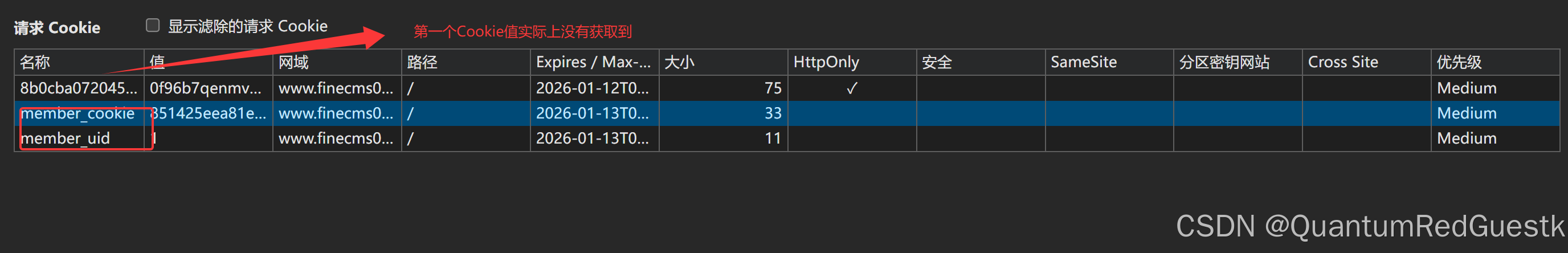 到此结束,发现cookie可以被获取,但不完全。默认httponly是关闭的,若会话 Cookie 未启用 HttpOnly 标志,则可能被恶意脚本读取,进而引发会话劫持可能。