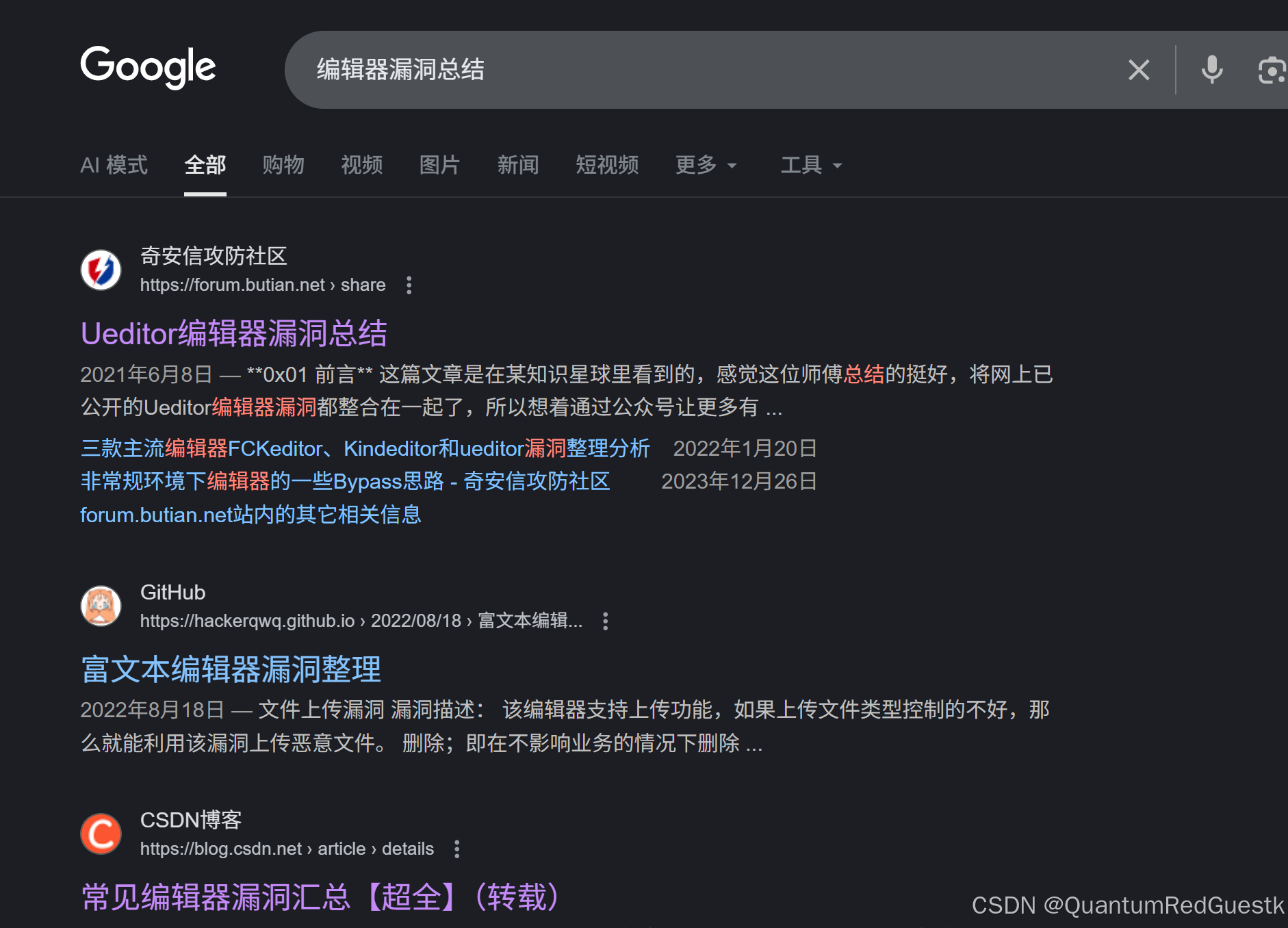 在浏览器搜索"编辑器漏洞总结",也是找到这个页面可能存在漏洞的方法之一。