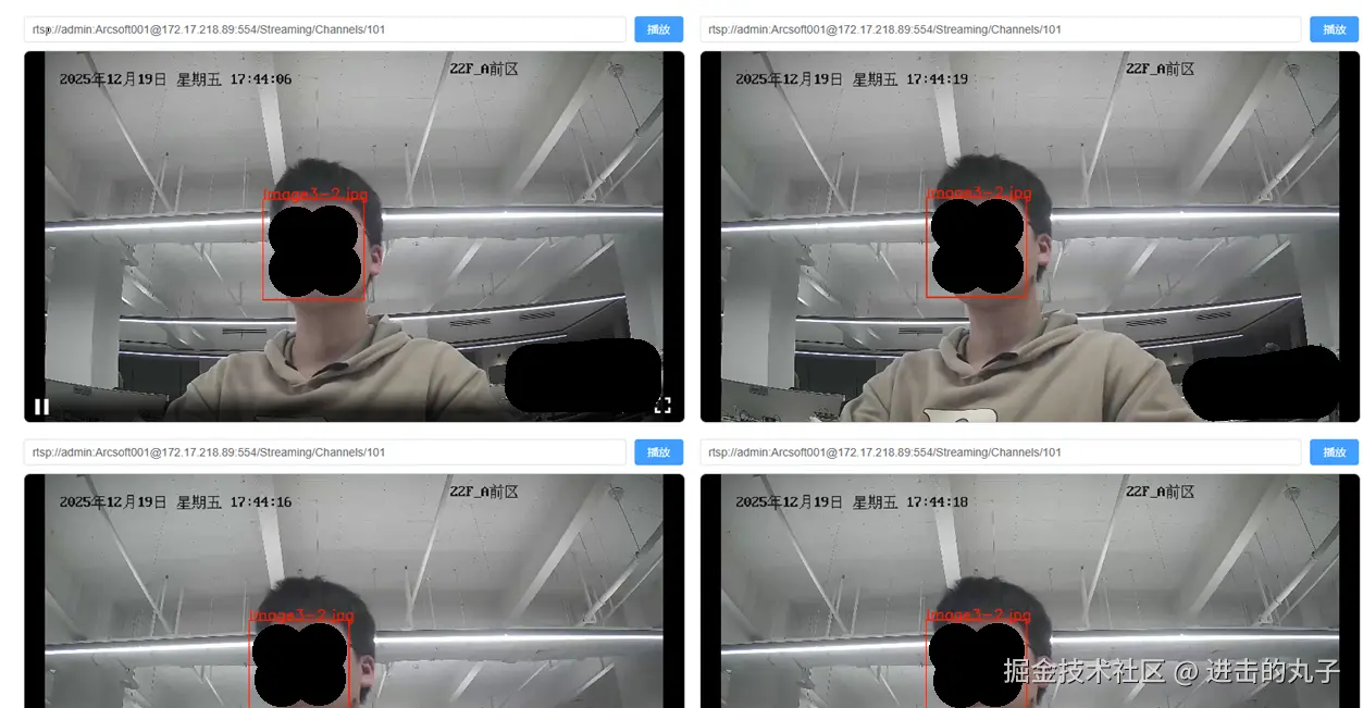 如下图(保护隐私,做了脱敏处理),输入多个RTSP地址,通过人脸识别检测后,会实时渲染到UI上。