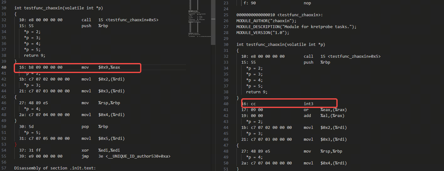 如上图对比,是只改了一个字节(上图是x86平台),我们拷贝一份ko出来,通过hexedit编辑对应的二进制里的内容把B8改成CC,然后objdump -S来解析出elf文件得到如下图内容: