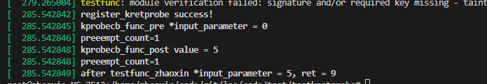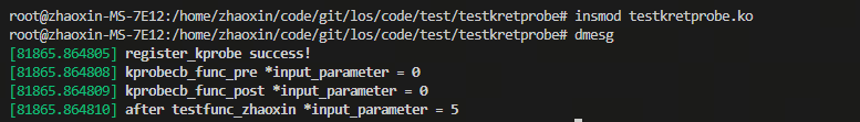 可以如下图看到用kprobe的pre_handler和post_handler抓到的被testfunc_zhaoxin修改的数值的式样的,post_handler里打印出来的_value的数值并不是testfunc_zhaoxin运行结束后的数值: