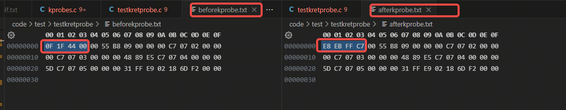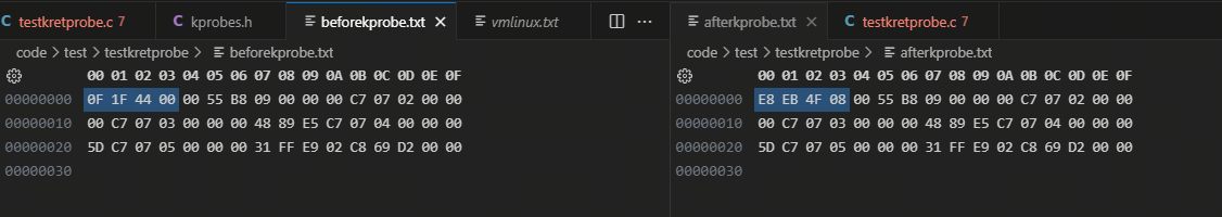 导出来后对比,可以发现,kretprobe的方式修改的内容也只是函数开头部分,也是E8EB开始: