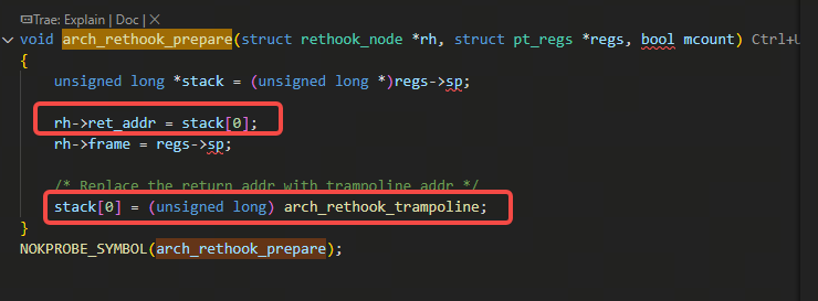 通过记录下来当前的stack[0]位置的函数的返回值,换成定义的arch_rethook_trampoline来让函数返回时先执行注册的函数。