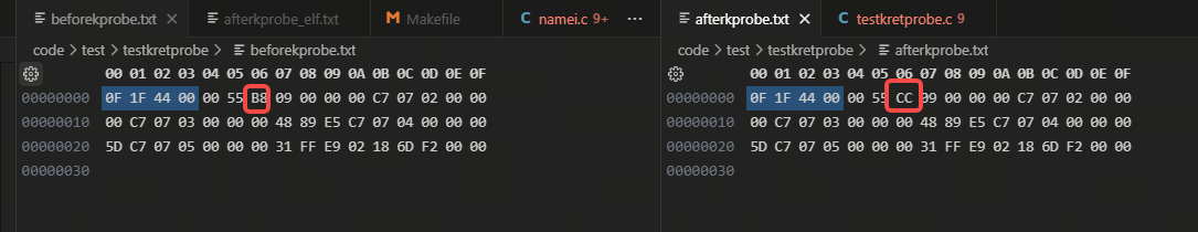 我们来抓一下看看kretprobe执行前后的相关代码段的改变。