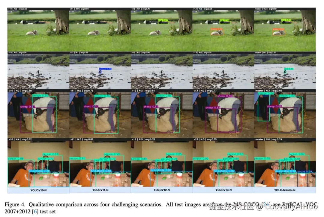 图4展示了四种代表性挑战性场景的定性比较。YOLO-Master-N 相较于基线方法表现出一致的改进: