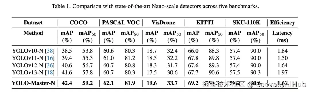 在MS COCO、PASCAL VOC、VisDrone等五大权威基准上,YOLO-Master全面超越最新YOLO版本: