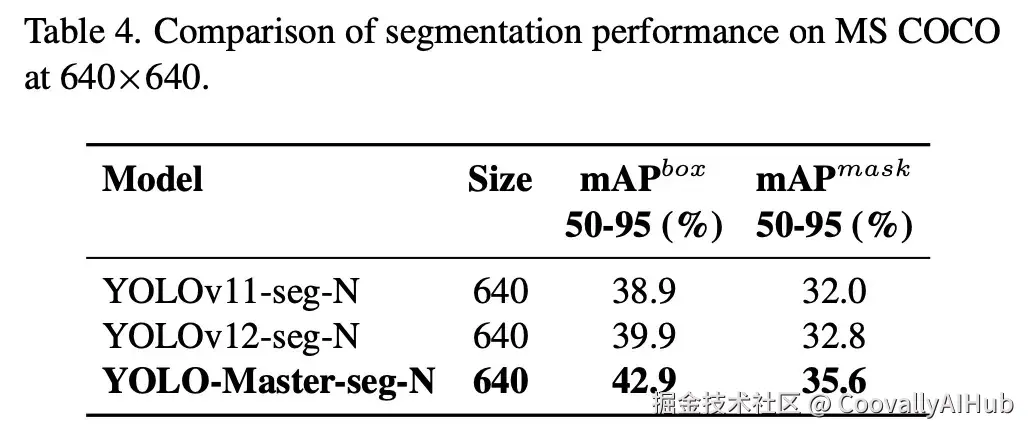 在表 4 中,YOLO-Master-seg-N 实现了 35.6% 的掩膜 mAP,超过了 YOLOv12-seg-N 2.8%,展示了在定位和掩膜预测方面的同步改进。