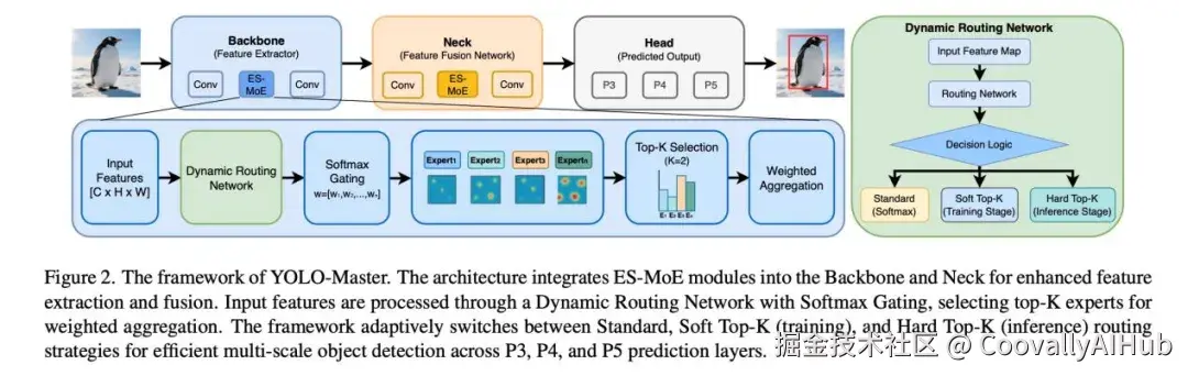 在本工作中,我们提出YOLO-Master,这是一个用于实时目标检测的新型类YOLO框架。YOLO-Master基于近期的YOLO架构构建,并引入了一个高效稀疏混合专家模型模块,以实现稀疏的、实例条件的自适应计算。如图2(左上)所示,YOLO-Master遵循标准的YOLO设计,包含骨干网络、颈部网络和检测头。我们的ES-MoE模块被插入到骨干网络和颈部网络中:在骨干网络中,它能跨不同目标尺度和场景复杂度动态增强特征提取;在颈部网络中,它支持多尺度自适应融合和信息精炼。