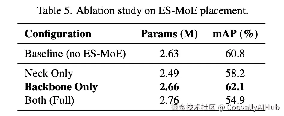 我们在表 5 中研究了 ES-MoE 模块的最佳放置策略。仅骨干网络集成 以 262 万参数取得了 62.1% mAP 的最佳性能,相比基线(60.8%)提升了 +1.3%。这验证了专家在早期特征提取阶段的专门化至关重要------骨干网络中的 ES-MoE 能够有效地学习尺度自适应和语义多样的表示,从而有利于下游检测。仅颈部网络集成 效果不佳,仅为 58.2% mAP(-2.6%),因为如果没有骨干网络提供的多样化输入特征,路由机制无法有效地实现专家专门化。普通的骨干网络产生同质化特征,限制了颈部网络发现互补专家模式的能力。令人惊讶的是,完全集成(同时置于骨干和颈部网络)严重降低了性能至 54.9% mAP(相比基线 -5.9%)。我们将此归因于级联路由机制之间的梯度干扰:骨干和颈部的 ES-MoE 模块在反向传播过程中会产生冲突的路由梯度,破坏了训练稳定性并阻碍了专家专门化。这一发现揭示了一个重要的设计原则:更多的 ES-MoE 模块并不能保证更好的性能,精心的放置对于避免负面交互至关重要。 基于这些结果,我们采用仅骨干网络集成 ES-MoE 作为默认配置,以平衡精度和训练稳定性。