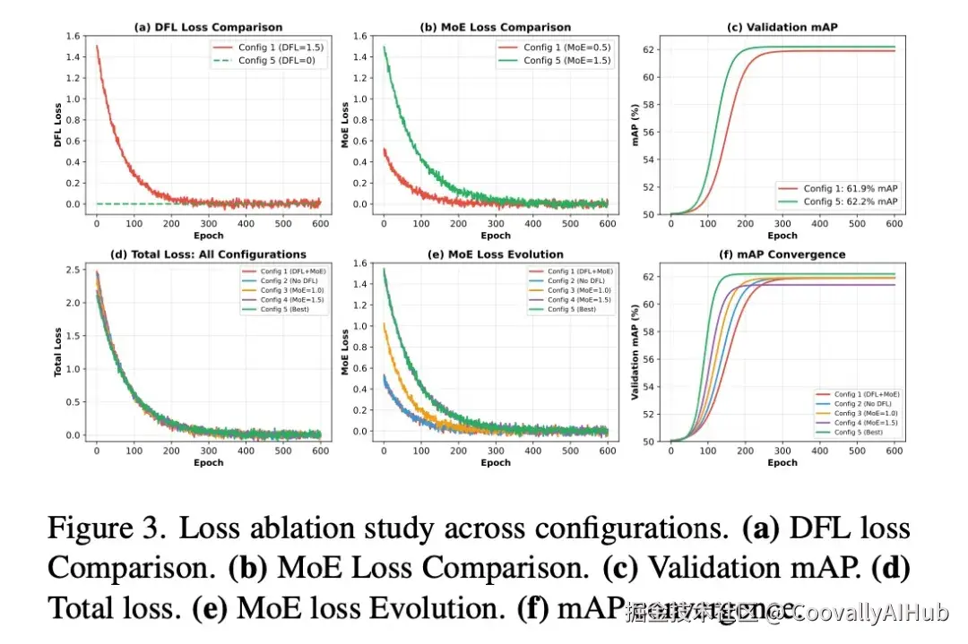 表 8 和图 3 分析了五种损失配置。出乎意料的是,完全移除 DFL 损失并仅使用 MoE 损失(权重=1.5)获得了 62.2% mAP 的最佳性能(比基线提升 +0.3%)。训练动态(图 3)解释了这一点:配置 4(DFL + 强 MoE λ=1.5)表现出严重的振荡,而配置 5(仅 MoE 损失)则平滑收敛。
