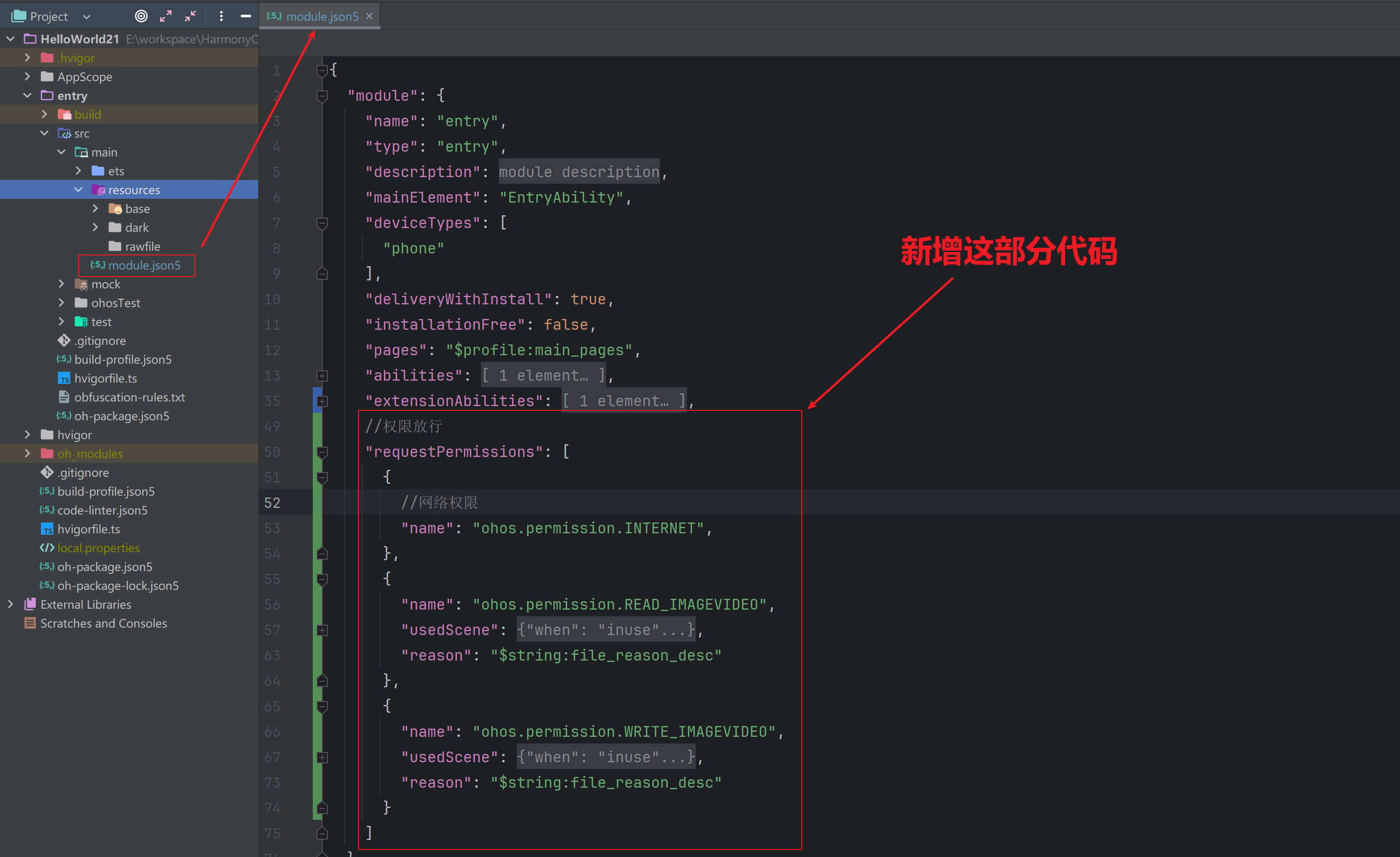 这种方式需要先在工程main目录下的【module.json5】文件中配置如下权限信息: