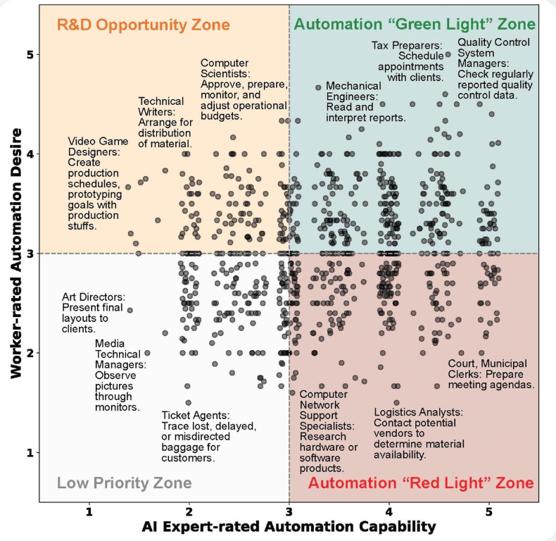 研究团队随后结合 AI 专家的判断,将各类任务划分为四个区域: