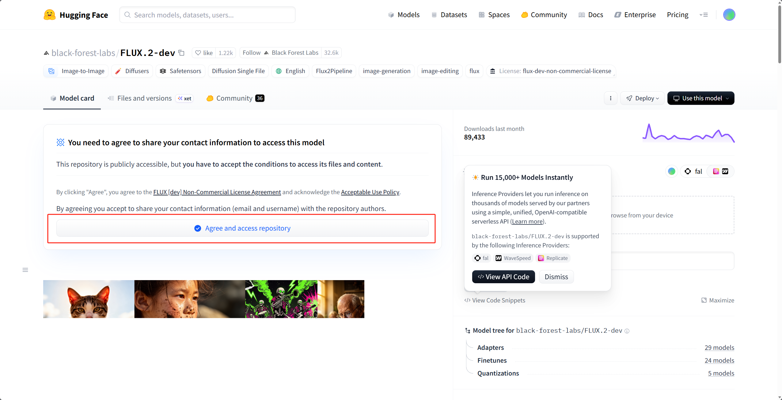 访问 FLUX.1-dev 页面,点击 "Agree and access repository" 。(由于我已经点击过了,所以这边用FLUX.2的界面做个示范)