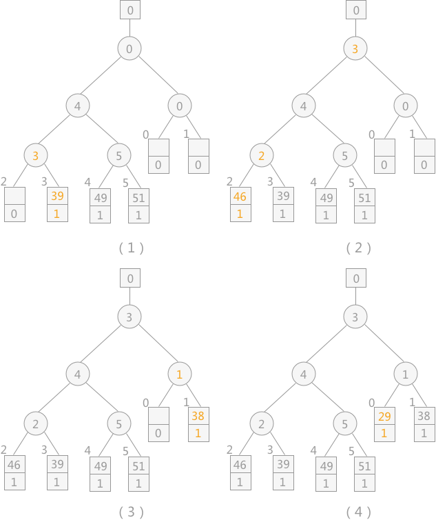 从初始文件依次读入关键字为 39、46、38、29 的记录,调整败者树如下图所示: