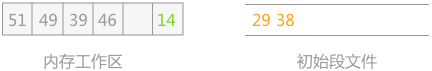 此时初始文件不为空,所以从中输入下一个记录 14 到内存工作区中,然后从内存工作区中的比 29 大的记录中,选择一个最小值作为新的 MINIMAX 值输出到 归并段文件中,如下图所示: