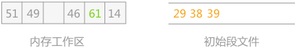初始文件还不为空,所以继续输入 61 到内存工作区中,从内存工作区中的所有关键字比 38 大的记录中,选择一个最小值作为新的 MINIMAX 值输出到归并段文件中,如下图所示: