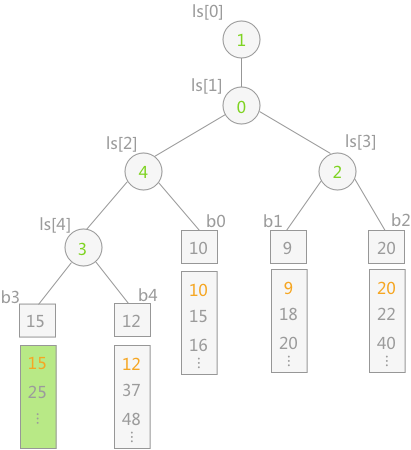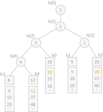 如图 2 所示为一棵 5-路归并的败者树,其中 b0---b4 为树的叶子结点,分别为 5 个归并段中存储的记录的关键字。 ls 为一维数组,表示的是非终端结点,其中存储的数值表示第几归并段(例如 b0 为第 0 个归并段)。ls[0] 中存储的为最终的胜者,表示当前第 3 归并段中的关键字最小。