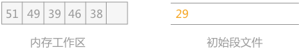 拿图 1 中的初始文件为例,首先输入前 6 个记录到内存工作区,其中关键字最小的为 29,所以选其为 MINIMAX 记录,同时将其输出到归并段文件中,如下图所示: