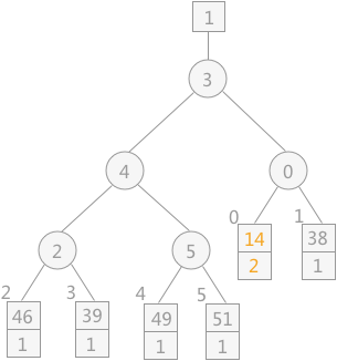 由败者树得知,其最终胜者为 29,设为 MINIMAX 值,将其输出到初始归并文件中,同时再读入下一个记录 14,调整败者树,如下图所示: