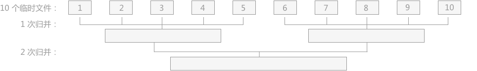如图 1 所示有 10 个初始归并段到一个有序文件,共进行了 4 次归并,每次都由 m 个归并段得到 ⌈m/2⌉ 个归并段,这种归并方式被称为 2-路平衡归并。