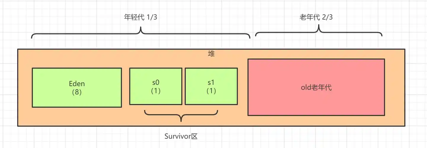 分区 :为了更高效地管理内存和进行垃圾回收,堆空间又划分为新生代 和老年代 。新生代进一步分为一个 Eden 区和两个 Survivor 区(From, To),默认比例是 8:1:1。新创建的对象首先在 Eden 区分配,经过一次 Minor GC 后存活的对象会被移到 Survivor 区,年龄增加到一定程度(默认15)后会被晋升到老年代。