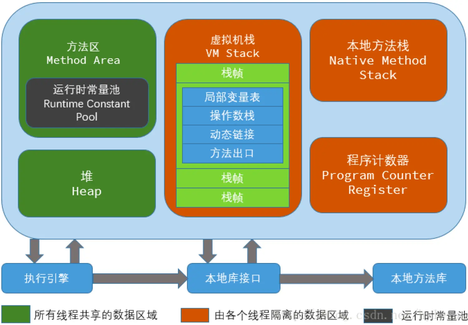 功能 :它描述了 Java 方法执行的内存模型 。每个方法在执行时都会创建一个栈帧 ,用于存储局部变量表、操作数栈、动态链接、方法出口等信息。方法从调用到执行完成的过程,就对应着一个栈帧在虚拟机栈中从入栈到出栈的过程。