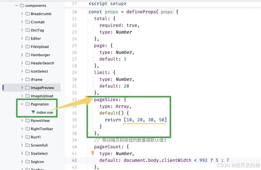 ruoyi-ui/src/components/Pagination/index.vue下,找到pageSizes数组中新增想要分页的数据量 :