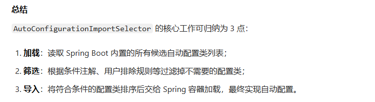 AutoConfigurationlmportSelector是 Spring Boot中一个重要的类,它实现了ImportSelector接口, 核心使命是按照特定规则筛选并导入符合条件的自动配置类**,让 Spring Boot 能 "自动" 完成大量配置工作,无需开发者手动编写 XML 或 Java 配置。