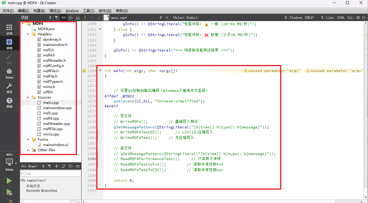 首先无论代码结构多么复杂,程序入口始终在main中,当调用的代码为独立的函数即可开始迁移,例如代码结构如下,main函数中分别是写文件和读文件代码函数: