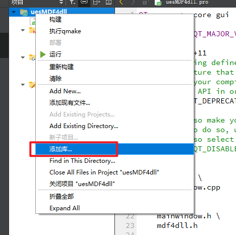将dll和a文件复制到项目路径下后,还得通过qt添加到项目中:右键项目-->添加库...