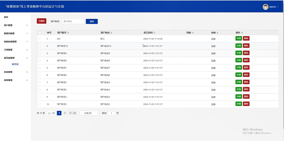 - 构建全流程购物与评价闭环:实现 "商品浏览 - 加入购物车 / 直接购买 - 订单提交 - 支付 - 物流跟踪 - 收货评价" 的完整购物链路,同时支持用户留言互动与管理员回复,提升用户参与感与购物体验完整性;