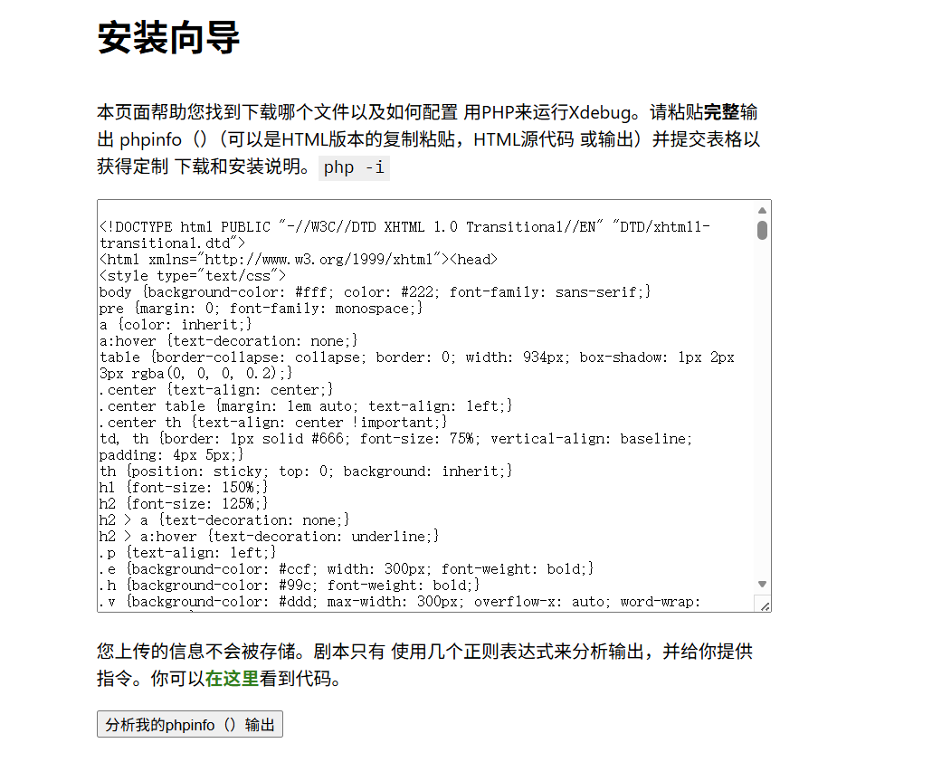 在页面中查看源码复制,粘贴到安装导向(Xdebug:支持 --- 定制安装说明)的空白框中,点击:分析我的phpinfo输出