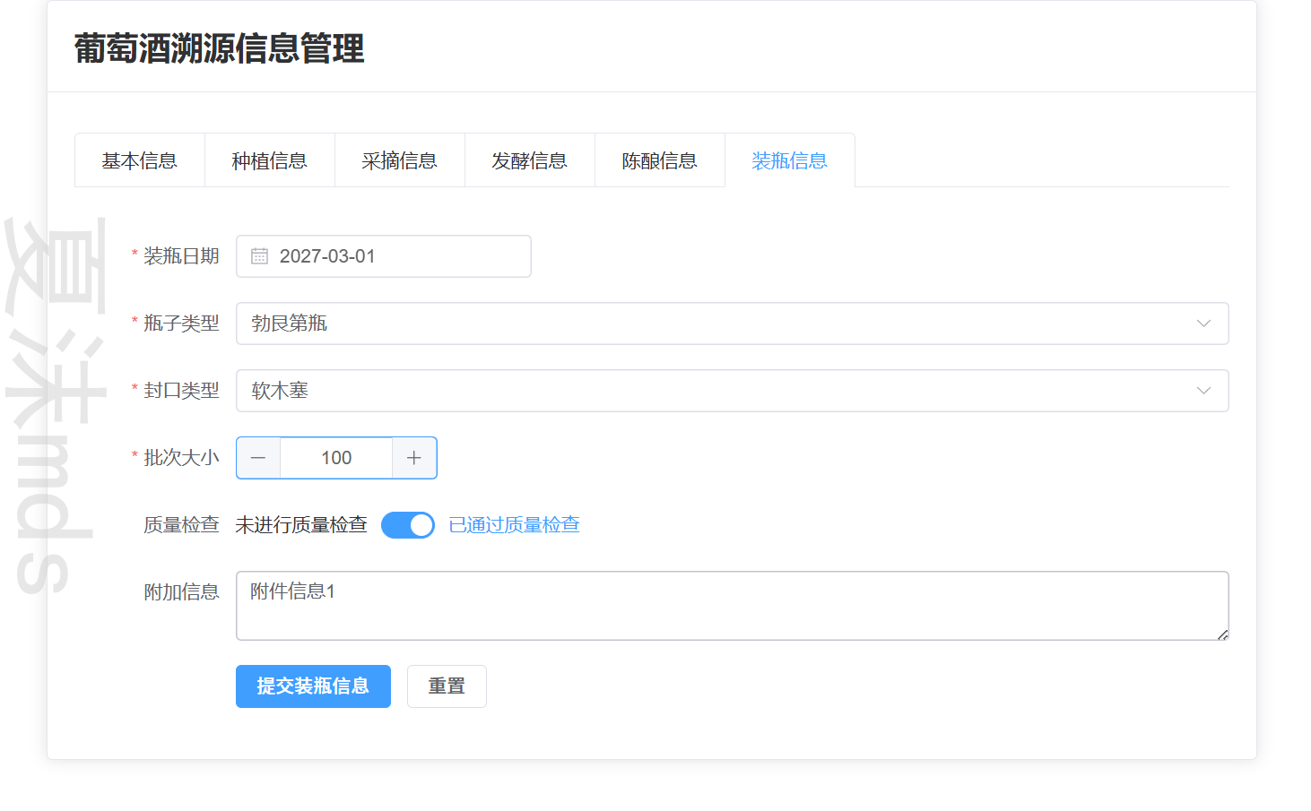 - 录入装瓶数据(瓶型、封口类型、批次等)
