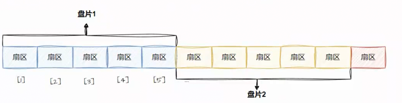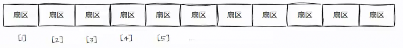 - 一整个磁盘有很多盘面,每一个盘面是一个一维数组,再把这些一维数组连接起来,这样整个磁盘我们都可以把它理解成一个一维数组