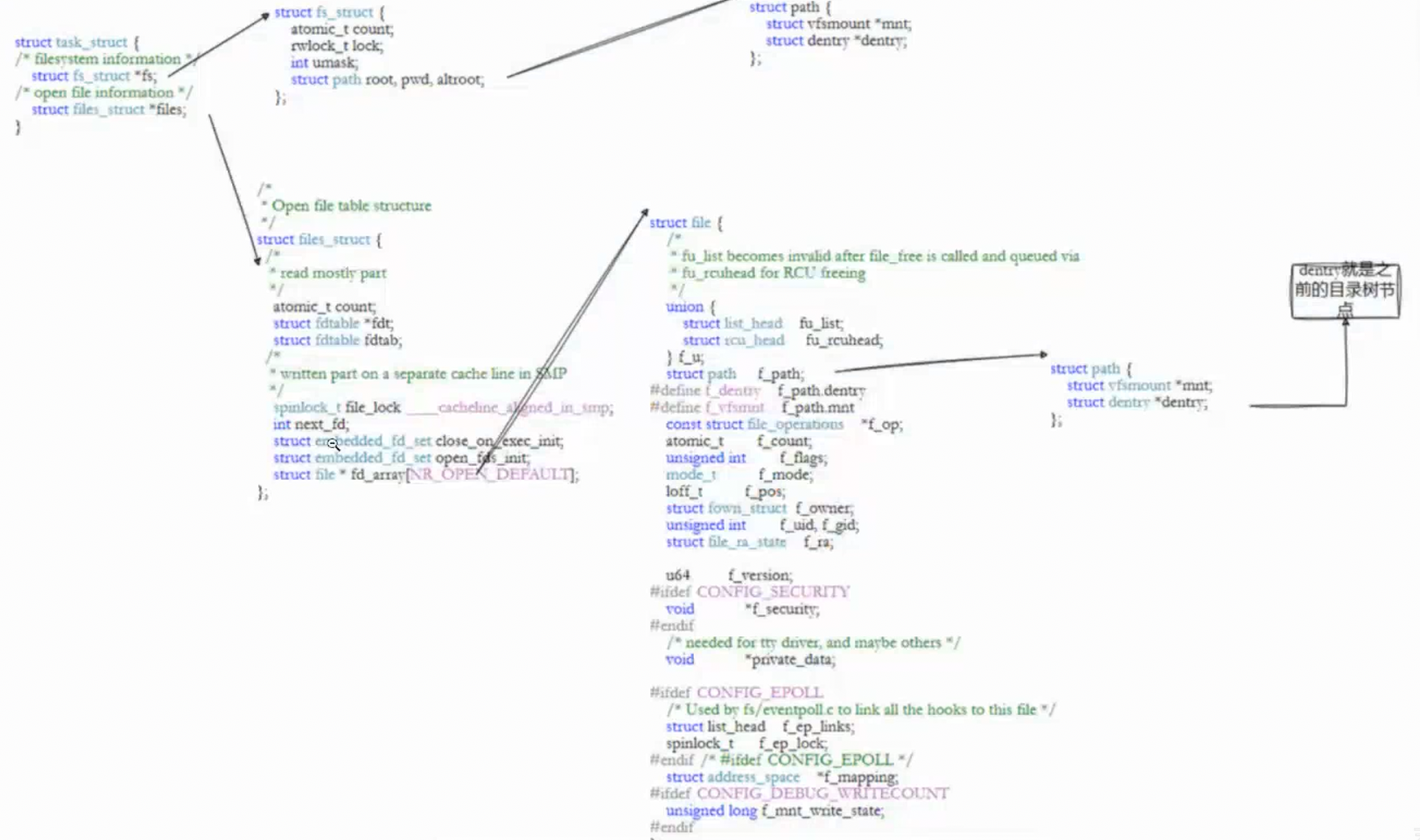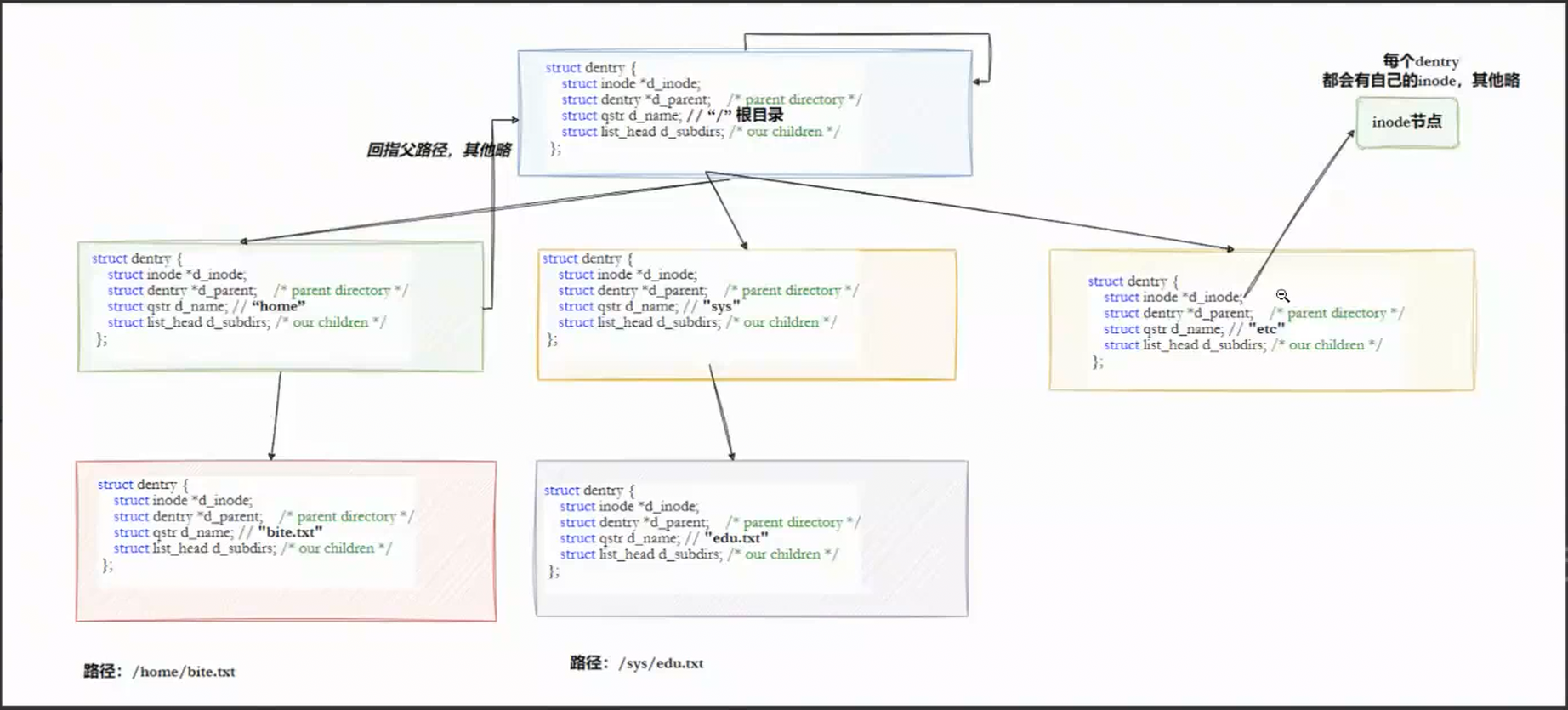 - 并不是只有目录有dentry结构体,普通文件也有自己的dentry结构体,在dentry的多叉树中属于叶子节点